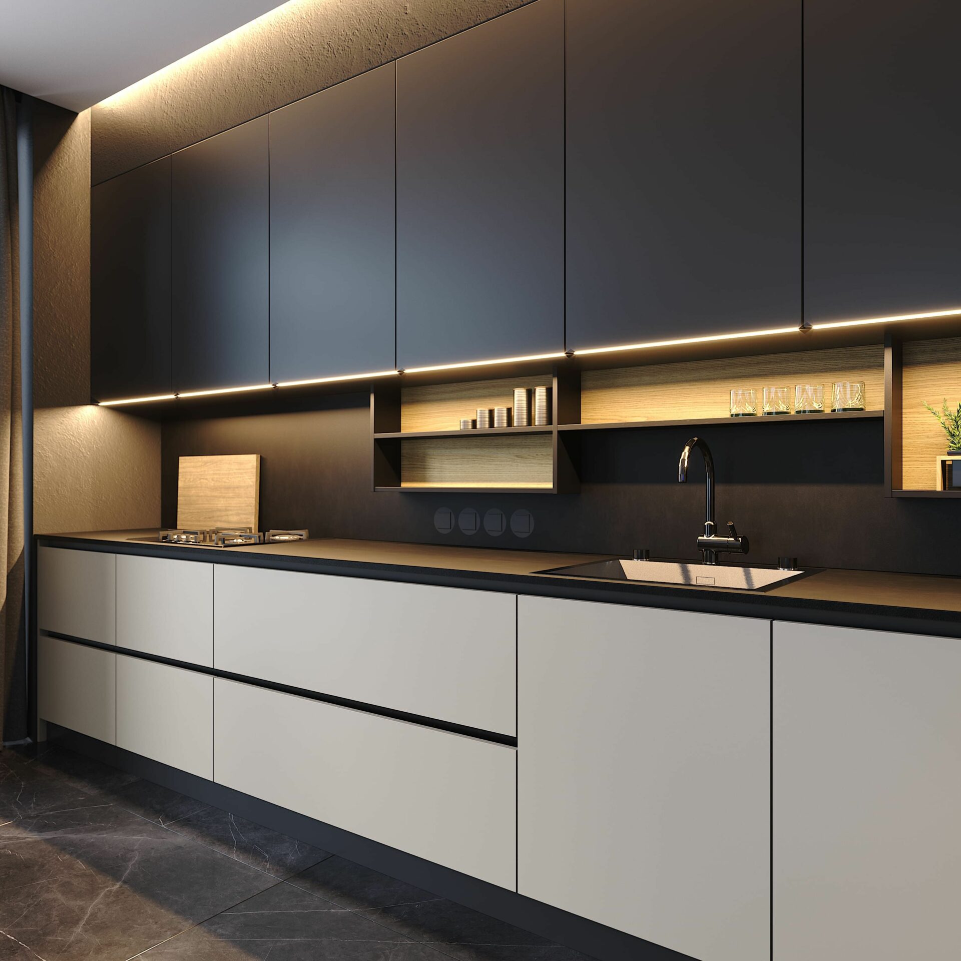 - Кујни со мазни и сјајни површини на кои штом го инсталираме и го поставиме вистинското осветлување, вашата кујна ќе блеска и секогаш ќе изгледа светло и чисто.